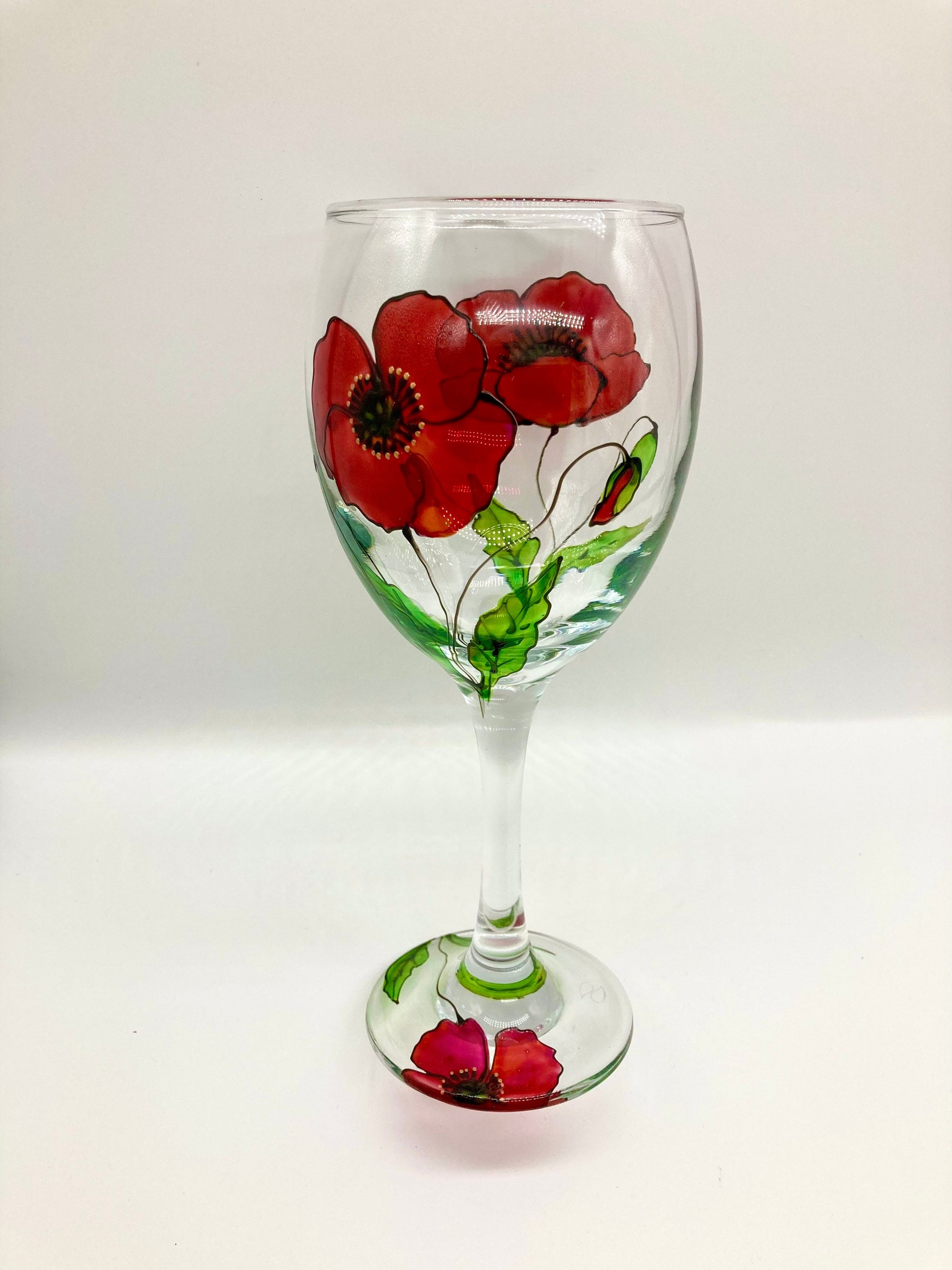 Poppy design wine gass. Beautifully hand painted with vibrant deep red poppies. Would make a very special and unique gift or a lovely addition to your own drink ware. Height 19.5cm, width at base 6.5cm, capacity 300ml.